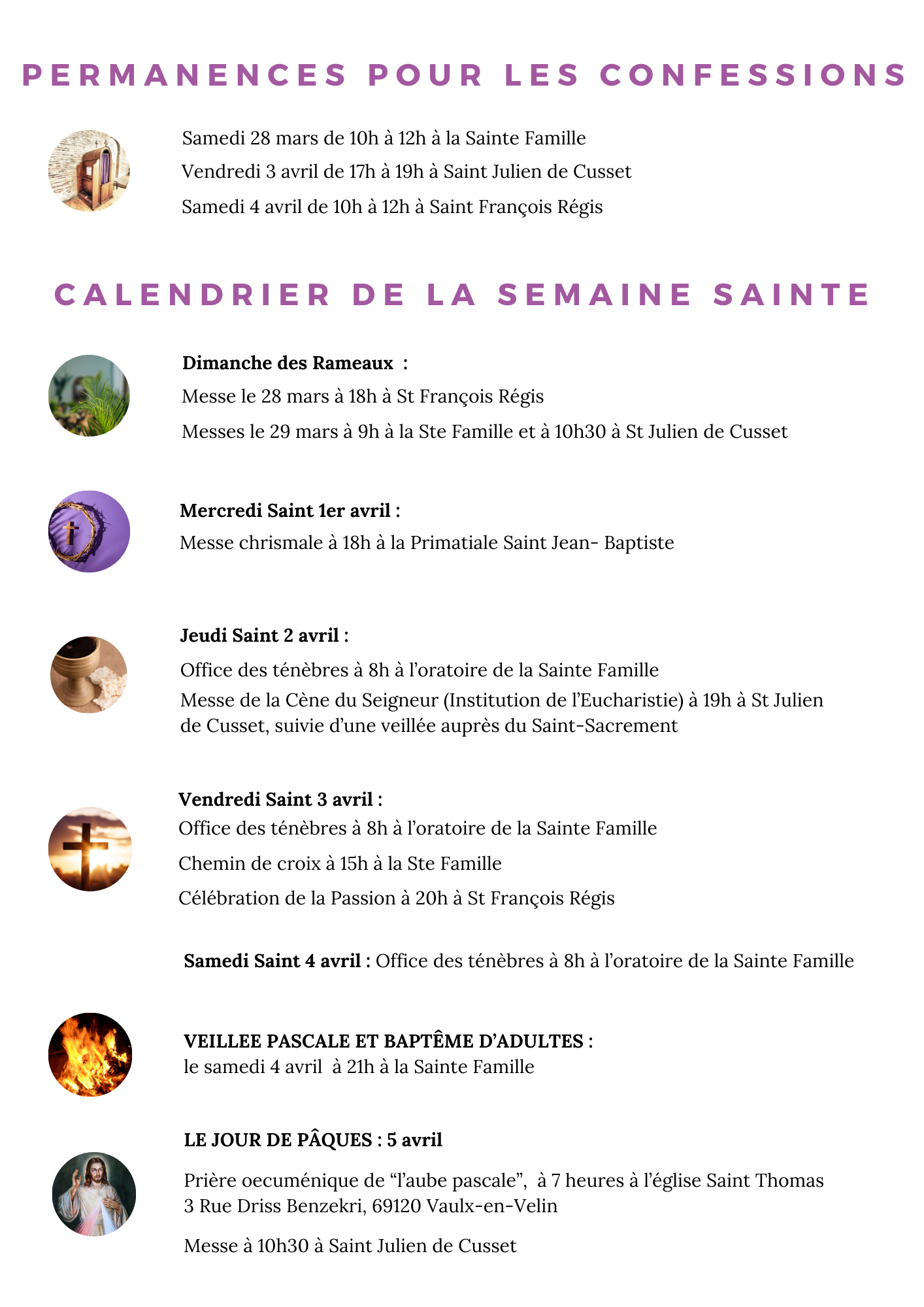 Ce carême, dans notre paroisse, sera destiné à une redécouverte de ce qu’est cet appel à la conversion qui nous est lancé par Jésus. Ce sera un chemin qui partira de notre appel fondamental à la vie et à l’amour, en traversant le mystère du péché (voilà une notion qui est aussi à redécouvrir !), un chemin qui nous permettra de mieux comprendre le sacrement de la réconciliation et qui doit nous préparer à célébrer Pâques avec des cœurs renouvelés, pour que notre vie en soit changée. Alors notre carême aura atteint son but : notre conversion !